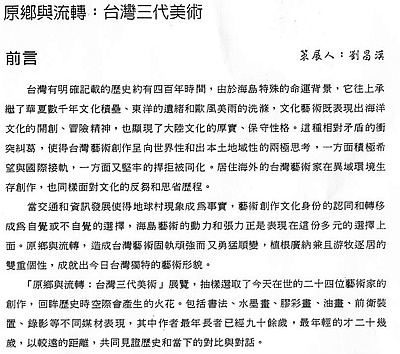 Place/Displace: Three Generations of Taiwanese Art, organized by the National Taiwan Museum of Fine Arts, is one of the first exhibitions in North America to explore issues of cultural identity in the contemporary art of Taiwan. The exhibition features more than 40 works by 24 artists, both native and overseas Taiwanese, and examines the identification and transformation of cultural identity as expressed in their highly diverse works. The works include ink painting, oil painting, sculpture, calligraphy, and video art, and they reflect the uniqueness of Taiwan’s history and culture.